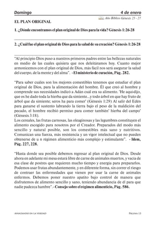 1) El documento describe el plan original de Dios para la alimentación humana según el Génesis, incluyendo solo frutas y verduras. 2) Explica cómo después del pecado original y el diluvio, se permitió el consumo limitado de carne. 3) Señala que Dios guió a Israel en el desierto principalmente con maná para restringir su régimen y corregir los hábitos adquiridos en Egipto.