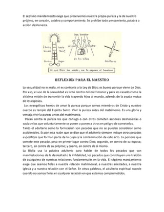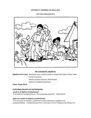 Este documento presenta una lección sobre el séptimo mandamiento "No cometerás adulterio". Explica que nuestro cuerpo es templo del Espíritu Santo y debe mantenerse puro. Define el adulterio como cualquier acción deshonesta o impura en pensamiento, palabra o comportamiento. También advierte sobre el "adulterio espiritual" que ocurre cuando no somos fieles en nuestras relaciones.