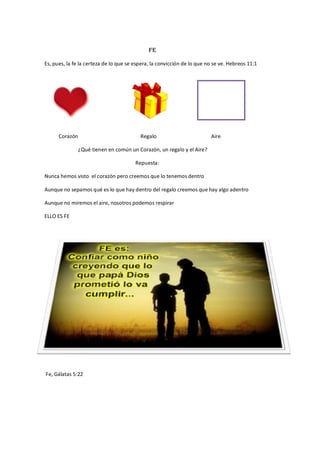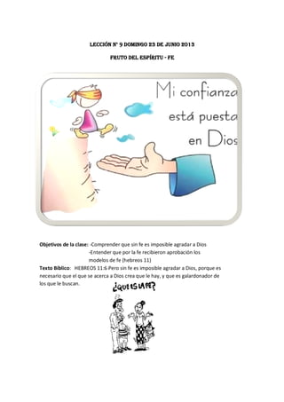 El documento habla sobre la lección bíblica del domingo 23 de junio de 2013 sobre el fruto del Espíritu de la fe. Explica que la fe es creer en lo que no se ve y cita varios versículos de Hebreos 11. También define la fe como una firme convicción y confianza en Dios y su Palabra.