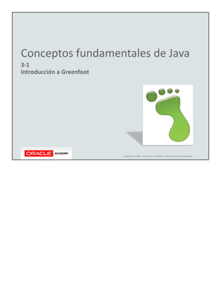 Este documento proporciona información sobre el entorno de desarrollo Greenfoot, incluyendo donde descargarlo, versiones compatibles, y que requiere Java. También describe brevemente los escenarios incluidos y cómo pueden parecer complicados al principio pero son útiles para aprender a desarrollar programas interactivos. Finalmente, discute conceptos como clases, subclases, instancias y herencia que son importantes en programación orientada a objetos.