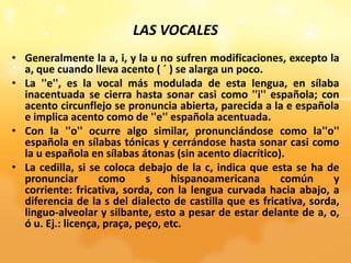 Este documento describe la fonética de la lengua portuguesa, incluyendo las vocales y consonantes. Explica que las vocales a, i y u suenan similar al español, mientras que la e y o se cierran en sílabas átonas. También describe los sonidos de las consonantes b, v, c, ç, s, z, ch, x, g, d, t, l, lh, nh, r, h, m, f, k, n, p, q, w y y y cómo difieren del español. El documento provee detalles sobre la