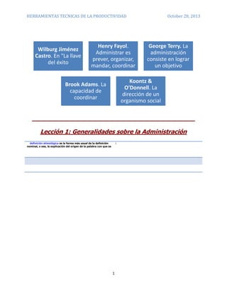 El documento resume las definiciones de administración de varios autores como Fayol, Terry, Adams, Koontz y O'Donnell. También incluye la definición propuesta por Wilburg Jiménez Castro basada en los conceptos anteriores, describiendo la administración como el proceso de prever, planear, organizar, integrar, dirigir y controlar el trabajo y recursos de una organización para alcanzar objetivos.