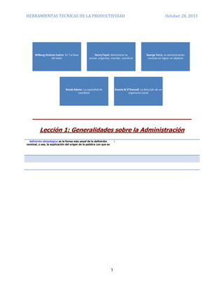 El documento presenta varias definiciones de administración de diferentes autores como Brook Adams, Koontz & O'Donnell, George Terry y Henry Fayol. Luego resume la definición de Wilburg Jiménez Castro como "el proceso de prever, planear, organizar, integrar, dirigir y controlar el trabajo de los elementos de la organización y de utilizar los recursos disponibles para alcanzar los objetivos preestablecidos".