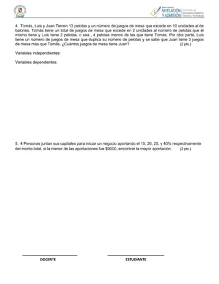 Este documento presenta un examen de nivelación para un curso de formulación estratégica de problemas en la Universidad Estatal de Milagro. Contiene 5 problemas o ejercicios para que el estudiante resuelva, cada uno con 2 puntos de calificación. El examen está supervisado por el profesor Lic. Víctor Chicaíza Vinueza y es para el módulo 2 del curso.