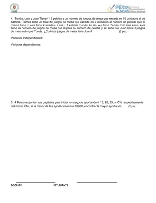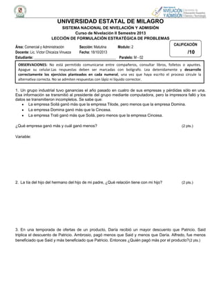 Este documento presenta una lección sobre formulación estratégica de problemas para estudiantes de un curso de nivelación en la Universidad Estatal de Milagro. Incluye cinco ejercicios de problemas con instrucciones para que los estudiantes los resuelvan y una sección para que el docente califique y haga observaciones.