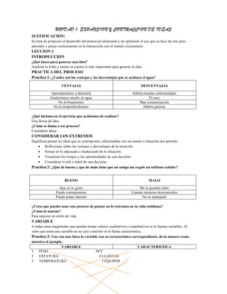 Este documento presenta varios procesos de pensamiento para generar y desarrollar ideas de manera efectiva. Explica cómo considerar ideas opuestas (los extremos), variables relevantes, y formular reglas. A través de ejemplos y prácticas, muestra cómo aplicar estos procesos para tomar mejores decisiones en la vida cotidiana y resolver problemas de manera más completa.