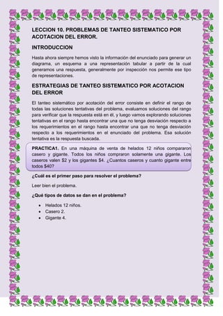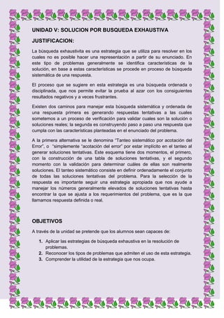 La unidad explica la estrategia de búsqueda exhaustiva para resolver problemas donde no es posible hacer una representación a partir del enunciado. Esta estrategia involucra una búsqueda sistemática de soluciones tentativas mediante tablas, seguida de una verificación para identificar las soluciones reales. Se enseñan métodos como el tanteo sistemático por acotación del error, donde se definen y exploran todas las posibles soluciones dentro de un rango hasta encontrar una que cumpla con los requisitos del problema.