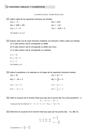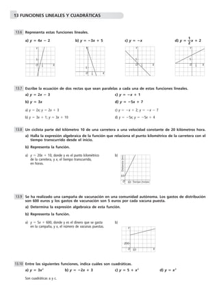 Este documento presenta ejercicios sobre funciones lineales y cuadráticas. Se piden identificar cuáles funciones son lineales o cuadráticas, hallar pendientes, ordenadas en el origen y vértices de parábolas. También se piden representar gráficamente funciones dadas y resolver problemas que involucran funciones cuadráticas.