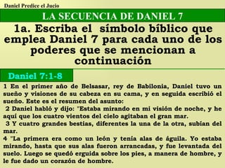 El documento describe la profecía de Daniel sobre una secuencia de imperios mundiales representados por bestias y cuernos. Explica que Daniel predijo el juicio de Dios contra el poder opresor representado por el cuerno pequeño, así como la purificación final del santuario celestial y el reino eterno de Dios.