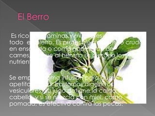El documento describe las propiedades y usos medicinales de varias hierbas y plantas como la menta, manzanilla, anís, romero y cola de caballo. Se detallan sus beneficios para la digestión, apetito, dolores, inflamaciones, infecciones, estrés y otros usos como repelente de insectos.