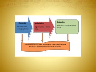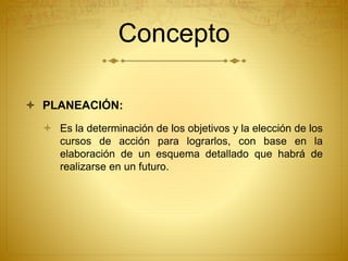 Este documento describe los conceptos clave de la planeación en mercadotecnia. Explica que la planeación estratégica es un proceso sistemático para establecer objetivos y desarrollar estrategias y tácticas para alcanzarlos. También describe las tres etapas del proceso de administración de mercadotecnia: planear, implementar y evaluar. Finalmente, resume los cinco pasos del proceso de planeación estratégica de mercadotecnia: análisis de situación, establecer objetivos, determinar posicionamiento, elegir