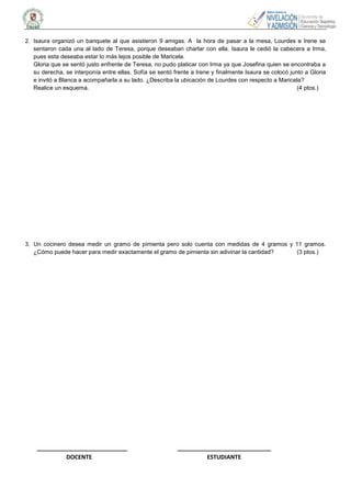 Este documento presenta un examen de nivelación para estudiantes de administración y comercio en la Universidad Estatal de Milagro. El examen contiene tres problemas que los estudiantes deben resolver, relacionados con transporte, ubicación de personas en una mesa, y medición de cantidades. Los estudiantes deben circular la alternativa correcta y no se permiten respuestas con lápiz o corrección.