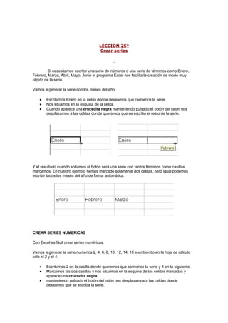 Este documento describe cómo crear series en Excel de forma rápida y automática. Explica que se puede generar una serie de meses del año o números escribiendo solo los primeros términos y seleccionando las celdas restantes, lo que permitirá que Excel complete la serie de forma automática.