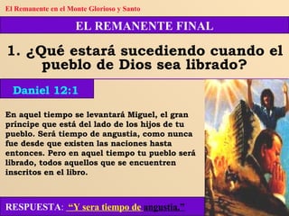 El documento habla sobre el remanente en los últimos días y su identificación a través de las profecías de Apocalipsis. Explica que el remanente guardará los mandamientos de Dios y tendrá el testimonio de Jesús, proclamando el mensaje de los tres ángeles a toda nación, raza y lengua. La única iglesia en la tierra que reúne estas características es la Iglesia Adventista del Séptimo Día.