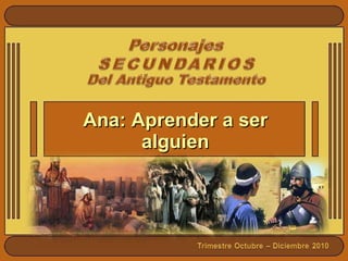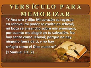 Este documento presenta una lección bíblica sobre la historia de Ana en el libro de 1 Samuel. Explica cómo Ana oraba a Dios para pedirle un hijo a pesar de vivir en un mundo desigual donde las mujeres sin hijos eran despreciadas, y cómo Dios respondió a su oración dándole un hijo llamado Samuel que ella dedicó al servicio de Dios. La lección enseña que Dios puede ayudarnos y reconstruir nuestras vidas a pesar de las injusticias en el mundo.