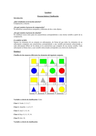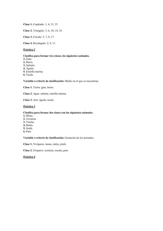 Este documento explica el proceso de clasificación, que implica separar un conjunto de elementos en subconjuntos de acuerdo a un criterio de clasificación compartido. Incluye ejemplos de clasificar varios grupos de objetos, animales y bebidas en clases basadas en criterios como el color, el medio ambiente, si son vivíparos u ovíparos, y la presencia o ausencia de alcohol. El objetivo es practicar aplicar diferentes criterios de clasificación y organizar los elementos correctamente en clases.