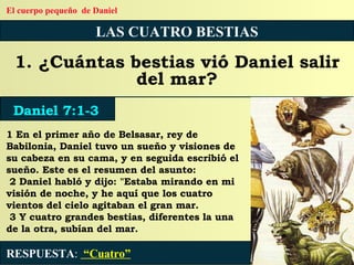Daniel tuvo una visión de cuatro bestias que representaban cuatro reinos mundiales. La primera bestia era un león con alas que representaba a Babilonia. La segunda era un oso que representaba a Medo-Persia. La tercera era un leopardo de cuatro cabezas que representaba a Grecia. La cuarta bestia era terrible, con dientes de hierro y diez cuernos, representando a Roma. Un pequeño cuerno se levantó entre los diez y dominó por un tiempo, tiempos y medio tiempo, representando al Anticristo. Finalmente