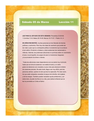 El documento habla sobre la importancia de controlar los pensamientos. Indica que los pensamientos afectan las acciones y la conducta, y que pensamientos negativos pueden causar angustia y problemas mentales. Recomienda enfocarse en pensamientos positivos como los descritos en Filipenses 4:8, y usar la oración y la meditación bíblica para mantener una mente sana.