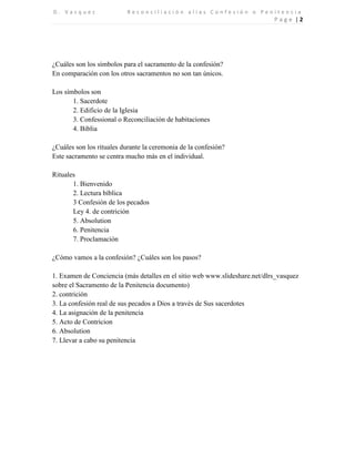 El documento resume los principales aspectos del sacramento católico de la reconciliación o confesión. Explica que es un sacramento de sanación que permite reparar la relación con Dios después de pecar. Detalla los símbolos como el sacerdote y la iglesia, los pasos de la ceremonia como la confesión de pecados y la absolución, y los pasos para prepararse incluyendo el examen de conciencia.