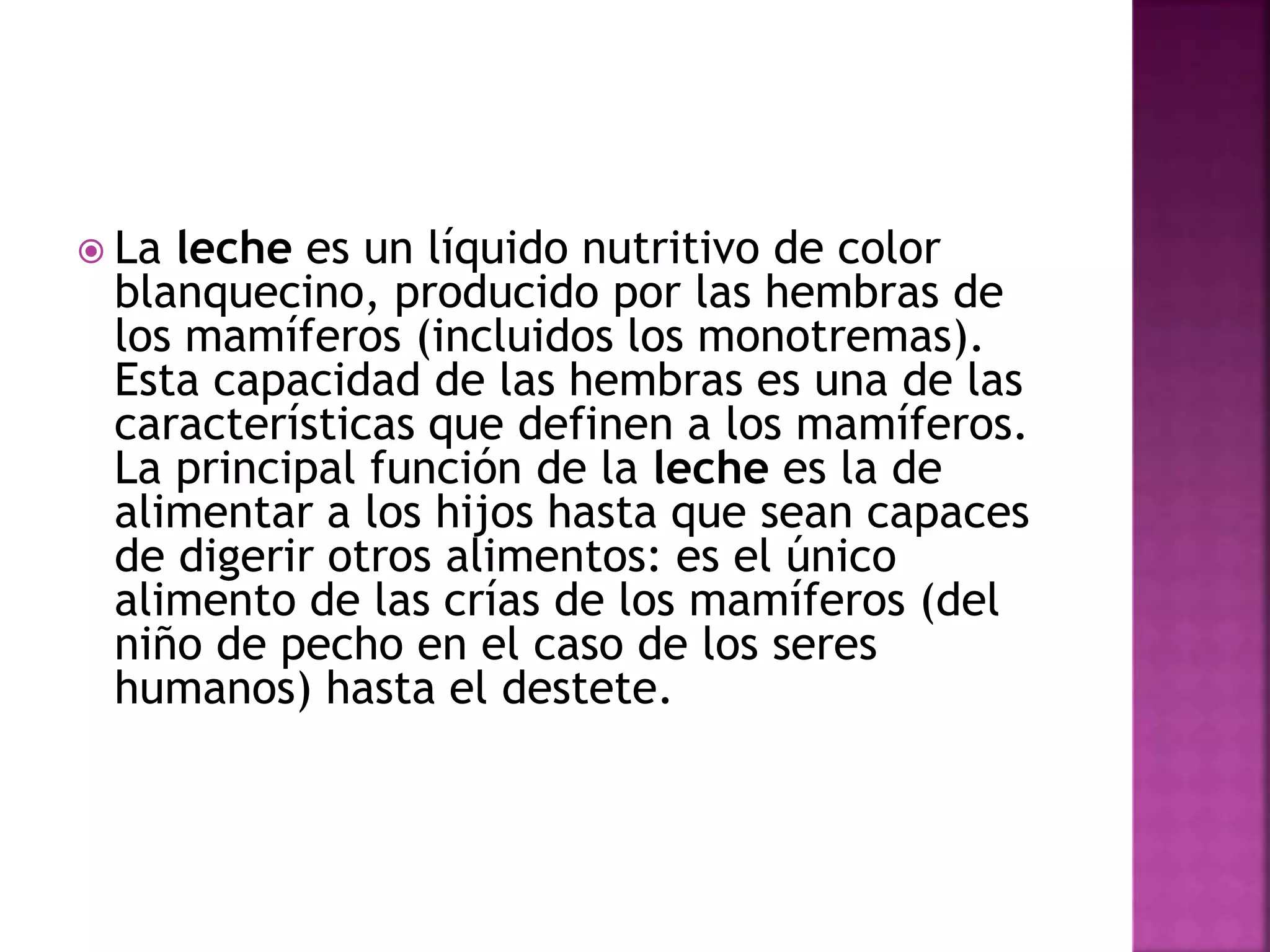 El documento proporciona información sobre la leche y sus derivados. Explica que la leche es un líquido nutritivo producido por las hembras de los mamíferos para alimentar a sus crías. También describe los principales tipos de leche, productos lácteos y sus procesos de producción, como la mantequilla, el queso, el yogur y otros. Además, brinda detalles sobre la composición de la leche y la historia de su consumo.