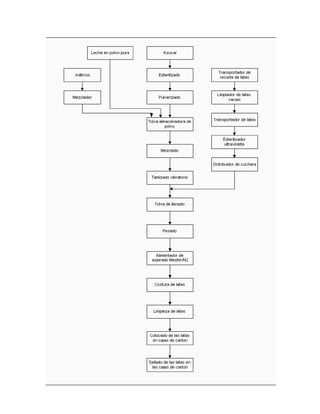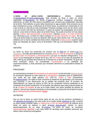 La leche en polvo se obtiene mediante la deshidratación de leche pasteurizada en torres de atomización, donde se evapora el agua para obtener un polvo blanco amarillento que conserva las propiedades de la leche natural. Se puede encontrar en tres clases básicas y puede o no estar fortificada con vitaminas. Para beberla, el polvo se disuelve en agua potable. Presenta ventajas como mayor vida útil y facilidad de almacenamiento y transporte en comparación con la leche líquida.