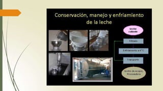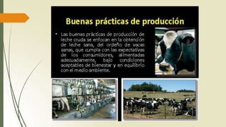 El documento describe la leche y sus derivados. La leche es un alimento antiguo producido por mamíferos para sus crías. La leche de vaca es la principal fuente de leche mundial. La leche está compuesta principalmente de agua, lactosa, proteínas, grasas y minerales. Es un alimento nutritivo pero también perecedero que requiere procesamiento y refrigeración. La industria láctea produce una variedad de productos lácteos a través de procesos como filtración, desnatado, tratamiento térmico y envasado.