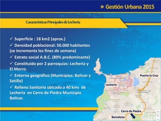 El documento detalla la situación del municipio turístico El Morro en Venezuela, incluyendo su superficie, población y características sociales. A través de diferentes períodos, se examinan los antecedentes de la gestión de residuos y los problemas financieros enfrentados por la empresa encargada del servicio, resaltando la necesidad de implementar un plan operativo de emergencia. Se establecen metas para mejorar la eficiencia del servicio, recuperar la confianza vecinal y asegurar la sostenibilidad financiera.
