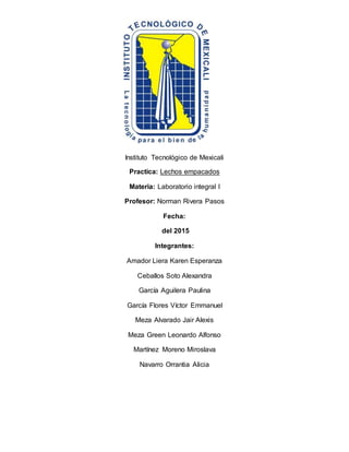 El documento describe un experimento sobre lechos empacados realizado por estudiantes. El objetivo era observar el cambio en la caída de presión cuando se agregan esferas en la parte inferior de una manguera. Los estudiantes midieron parámetros como velocidad, densidad y presión del agua con y sin las esferas, y calcularon valores como porosidad y número de Reynolds. Sus resultados mostraron un cambio en el flujo y la presión debido a los huecos creados por las esferas en el lecho empacado.