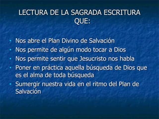 La Lectio Divina es una práctica de obediencia y escucha de la Palabra de Dios a través de la lectura pausada y meditada de las Escrituras. Esta lectura lenta permite que la Palabra de Dios entre en el corazón y llene el espíritu, en contraste con la lectura rápida y superficial. La Lectio Divina incluye etapas de lectura, meditación, oración y contemplación para aplicar a la vida lo que se ha leído y recibido de Dios. Se recomienda realizar este ej