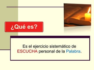 El documento describe los cuatro pasos de la Lectio Divina, una práctica de lectura y meditación de la Biblia. Los cuatro pasos son: 1) Leer el texto bíblico atentamente para comprender su significado; 2) Meditar el texto insertándolo en la propia vida; 3) Orar sobre el texto en diálogo con Dios; 4) Contemplar cómo la Palabra inspira la vida y una nueva forma de mirar la realidad con ojos de fe. El objetivo es descubrir la voluntad de Dios a través del encuentro con É