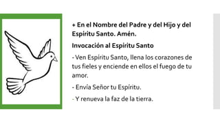 El documento presenta un resumen de la lectura del Evangelio de Lucas 4:21-30 sobre Jesús rechazado en su tierra natal. Incluye oraciones de invocación al Espíritu Santo, el Ave María y el Padre Nuestro. Finaliza con una oración a la Virgen María pidiéndole protección.