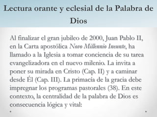 Este documento describe la Lectio Divina, una práctica de lectura orante y eclesial de la Palabra de Dios. Explica que la Lectio Divina implica leer un pasaje bíblico (lectio), meditar sobre su significado (meditatio), orar sobre lo que se ha leído y meditado (oratio), y contemplar a Dios (contemplatio). El documento también señala que este método de oración bíblica fue sistematizado por Guigo II en el siglo XII y sigue siendo la base para orar la Pal