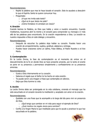 Este documento describe la Lectio Divina como una experiencia espiritual de encuentro con Dios a través de la lectura de la Biblia. Siguiendo un esquema de invocación, lectura, meditación, oración, contemplación y acción, la Lectio Divina busca que la persona se deje interpelar personalmente por la Palabra de Dios y responda a través de la oración y cambios en la vida cotidiana.