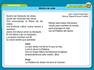 El documento presenta una introducción a la Lectio Divina para niños. Explica que la Lectio Divina es una forma de orar con la Palabra de Dios a través de cuatro pasos: lectura, meditación, oración y contemplación. También presenta a los personajes Palabritas y sus amigos, e incluye consejos para que los niños aprendan a rezar utilizando la Biblia.