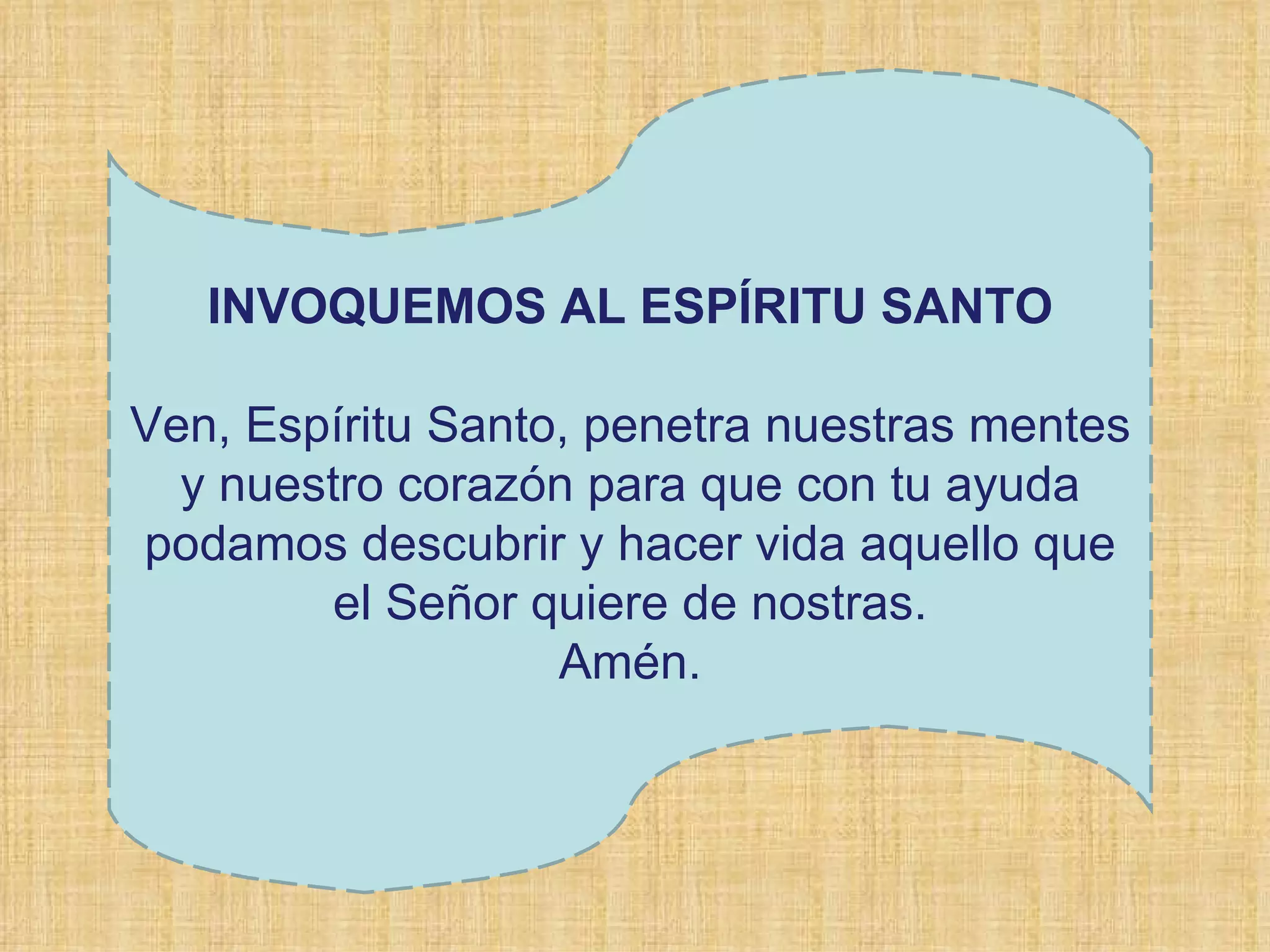 Jesús promete enviar el Espíritu Santo a sus discípulos para que esté siempre con ellos y no se sientan huérfanos. Jesús invita a cumplir sus mandamientos como forma de demostrarle amor, y asegura que aquellos que los cumplan serán amados por él y por el Padre. El documento también insta a los lectores a reflexionar sobre cómo han vivido el amor a Dios y sobre cómo mejorar en ello.