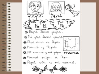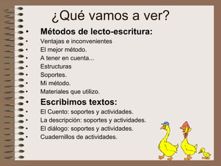 Este documento presenta un método mixto global para la enseñanza de la lectoescritura. Describe los materiales utilizados como libros de texto, cuadernos, cuadernillos de trabajo y fichas. Explica cómo trabajar textos como cuentos, descripciones y diálogos a través de soportes visuales y actividades. También destaca la importancia de cuadernillos de actividades para reforzar elementos lingüísticos y comprensión lectora a lo largo de los ciclos.