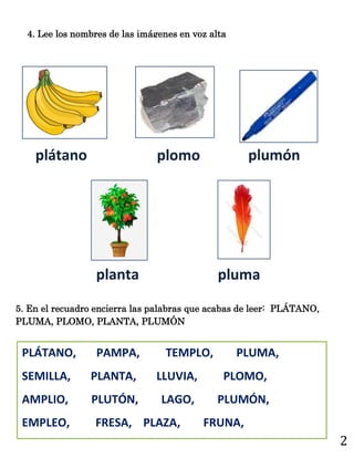 Mercedes come plátano con su familia. El documento presenta varias actividades para practicar palabras que comienzan con los sonidos "pla", "ple", "pli", "plo", "plu". Las actividades incluyen leer palabras, subrayar respuestas a preguntas, recortar tarjetas con imágenes y nombres, completar palabras separándolas en sílabas y letras, y escribir las palabras de manera ligada. El objetivo es que los estudiantes aprendan a leer, escribir y reconocer palabras que comienzan con est