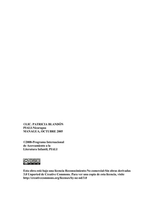 Este documento discute la importancia de promover la creatividad literaria en los niños. Argumenta que la creación literaria infantil les permite desarrollar su estilo propio y sentirse valiosos. También describe varios juegos literarios, como "Continúa el cuento" y "Escribe la primera parte del cuento", que estimulan la imaginación de los niños. El objetivo final es fomentar el derecho de los niños a soñar y usar su imaginación.