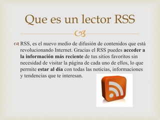 Este documento describe lo que es un lector RSS y cómo funciona. Un lector RSS permite a los usuarios acceder a la información más reciente de sus sitios web favoritos sin necesidad de visitar cada página, manteniéndolos al día. Los lectores RSS más populares incluyen Google Reader, Feedly, Netvibes y The Old Reader. Estos lectores RSS revisan los feeds de las páginas web a las que el usuario se ha suscrito y muestran los nuevos contenidos a medida que se publican.