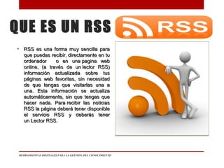 Este documento habla sobre los lectores RSS. Explica que RSS es una forma sencilla de recibir actualizaciones de páginas web favoritas de forma automática sin necesidad de visitarlas individualmente. Describe que los lectores RSS funcionan suscribiéndose a fuentes RSS en páginas web y recibiendo las actualizaciones, y que existen diferentes tipos de lectores como los que se instalan en el ordenador, los online o los integrados en el navegador web o correo electrónico.