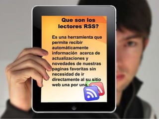 Este documento describe los lectores RSS, que permiten recibir automáticamente actualizaciones de páginas web favoritas sin visitarlas individualmente. Los lectores RSS funcionan suscribiéndose a los feeds RSS de sitios y mostrando nuevos contenidos a medida que se actualizan. Esto permite a los usuarios mantenerse informados de manera conveniente sobre noticias y sitios de su interés almacenando las actualizaciones en un solo lugar. Existen lectores RSS de escritorio, en línea y también integrados en navegadores y correos electr