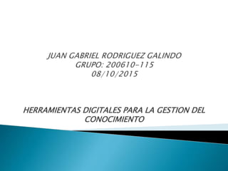 Este documento describe las herramientas RSS como una forma de gestionar el conocimiento digitalmente. Los lectores RSS notifican a los usuarios sobre las actualizaciones y noticias de páginas web de interés de manera automática y sin necesidad de visitar cada página individualmente. Esto facilita y agiliza el acceso a información relevante de varias fuentes en una sola ubicación.