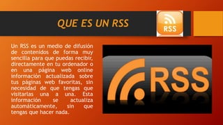 Este documento explica qué es un RSS y cómo funciona. Un RSS permite que los usuarios reciban actualizaciones de contenido de páginas web de su interés de forma automática y sin necesidad de visitar cada sitio individualmente. El documento describe el proceso de suscripción a RSS y cómo los lectores RSS revisan periódicamente las fuentes RSS vinculadas para mostrar nuevos contenidos a los usuarios. Finalmente, el documento discute algunos tipos comunes de lectores RSS y sus ventajas y desventajas.