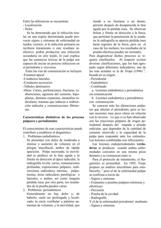 Este documento discute la interrelación entre las enfermedades de la pulpa dental y las enfermedades periodontales, las cuales a menudo son difíciles de diagnosticar debido a que los procesos patológicos de una pueden iniciar los de la otra a través de varias vías de comunicación. Los procesos pulpares y periodontales son causantes de más del 50% de la mortalidad dentaria. El pronóstico depende de factores como la causa primaria y la respuesta del huésped, por lo que el tratamiento correcto es crucial y