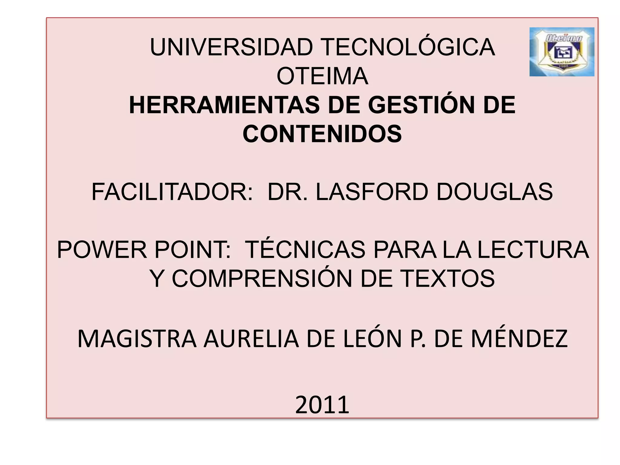 UNIVERSIDAD TECNOLÓGICA OTEIMA HERRAMIENTAS DE GESTIÓN DE CONTENIDOS FACILITADOR: DR. LASFORD DOUGLAS POWER POINT: TÉCNICAS PARA LA LECTURA Y COMPRENSIÓN DE TEXTOS MAGISTRA AURELIA DE LEÓN P. DE MÉNDEZ 2011