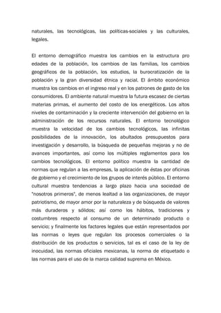 El documento describe el ambiente de la mercadotecnia, dividido en microambiente y macroambiente. El microambiente incluye la empresa, canales de distribución, mercados, competidores y públicos. El macroambiente considera factores demográficos, económicos, naturales, tecnológicos, políticos, culturales y legales. El análisis del ambiente permite definir estrategias de mercadotecnia y adaptar productos a las necesidades de los consumidores.