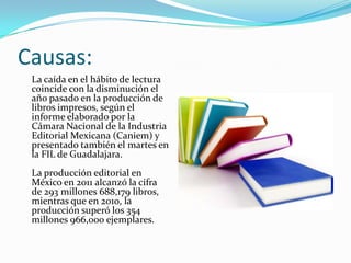El índice de lectura de los mexicanos cayó un 10% en los últimos 6 años, mientras que el promedio de libros leídos por persona se mantuvo en 2.94 libros al año. Las principales razones dadas por los mexicanos para no leer son falta de tiempo y preferencia por otras actividades recreativas. La caída en el hábito de lectura coincide con una disminución en la producción de libros impresos el año pasado.