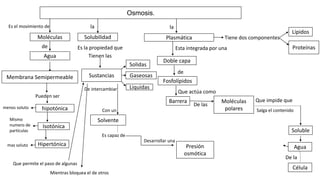 La osmosis es el movimiento de moléculas de agua a través de una membrana semipermeable. Una membrana semipermeable permite el paso de agua pero bloquea el paso de otras sustancias como iones y moléculas grandes. La osmosis ocurre cuando dos soluciones de diferente concentración están separadas por una membrana semipermeable, moviéndose el agua de la solución más diluida a la más concentrada hasta que se iguala la presión osmótica de ambas soluciones.