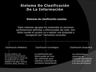 La clasificación de la información es el proceso de caracterizar tipos, estructuras y valores de la información para que las organizaciones extraigan valor de ella. Una vez clasificada, la información puede llevarse al nivel de infraestructura adecuado para optimizar su valor y minimizar los costos de gestión y almacenamiento. Los sistemas de clasificación pueden ser exactos, alfabéticos, cronológicos, geográficos o ambiguos como los orientados a audiencias, temas, tareas o metafóricos.
