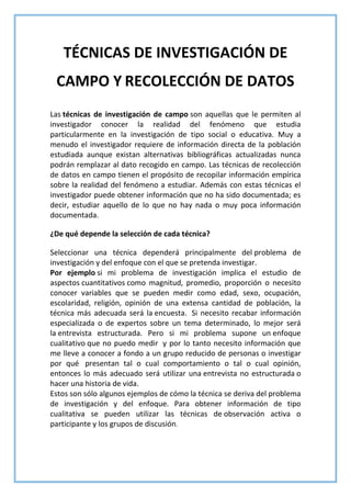 Este documento describe diferentes técnicas de investigación de campo y recolección de datos como la observación, encuesta y entrevista. Explica que la selección de una técnica depende del problema de investigación y enfoque. La observación puede ser pasiva o participante, mientras que las entrevistas pueden ser estructuradas o no estructuradas. Las encuestas utilizan cuestionarios para obtener información de una gran población.